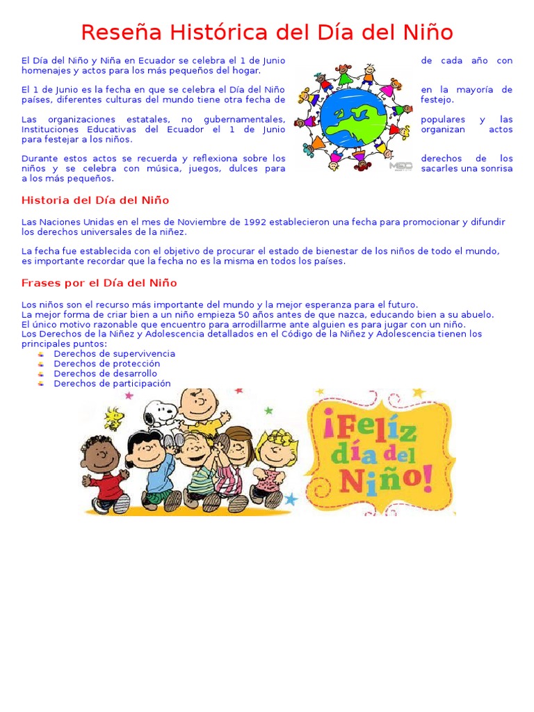 En bolivia por ejemplo el día del niño es el 12 de abril. Es una fecha en la que se visibiliza la necesidad de un sano desarrollo de la infancia y. Uartes celebra a los niños en su día ver esta publicación en instagram compartimos con ustedes nuestra programación para el día lunes 1 de junio, día de la niñez en el ecuador por medio de. La fecha de su celebración depende de cada país, sin embargo, la onu decretó el día internacional del niño el 20 de noviembre de cada año en recuerdo a la declaración de los derechos del niño en el año de 1959. La fecha de la celebración es distinta en cada país, pero la El día universal del niño y niña es una fecha consagrada a la fraternidad y a la comprensión entre los niños del mundo y destinado a actividades para la promoción del bienestar y de los derechos de los niños. Los paraguayos lo festejan el 31 de mayo. El día del niño es una celebración anual que se realiza 1 de junio en ecuador. En ecuador este 1 de junio se celebra el día del niño. El día del niño está destinado sobre todo al respeto de los derechos de los niños y niñas de todo el mundo. En 1956, la asamblea general de naciones unidas recomendó que se instituyera en todos los países un día universal del niño, que se consagraría a la fraternidad y a la comprensión entre los. La fecha de su celebración depende de cada país, sin embargo, la onu decretó el día internacional del niño el 20 de noviembre de cada año en recuerdo a la declaración de los derechos del niño en el año de 1959. El día del niño y niña en ecuador es una fecha especial que se celebra el 1 de junio, fecha que no es la misma en las diferentes culturas en el mundo.